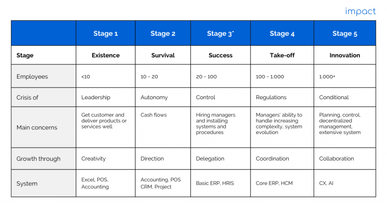 Stage 3 is called the Success Stage, where companies have found their identity and are comfortable with its cash flows, usually with 20 – 100 employees. There is a crisis of control and the key to growth is through proper work delegation which involves hiring managers and installing systems and procedures. At this stage, integration between divisions and automation are crucial and this is where companies start needing ERP and HR systems.